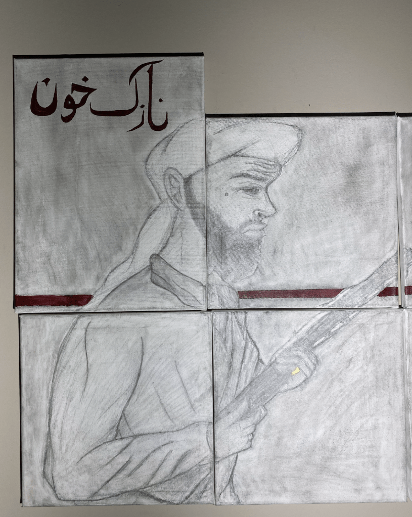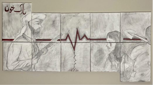 The title of this art piece is Nazukh Khoon (the title appears in the top left on the piece), which is in Urdu, and it translates to Fragile Blood in English. The piece itself is a transfusion between graphite sketching and minor detailing using various materials like paints, glass, and gilding. It portrays an armed father looking at his daughter running away with the person she wants to marry. The inspiration was drawn from the intersections of the unseen or unnoticed caste-like system in Pakistan and its most violent expression, which is honour killing. It also highlights how employment, class and blood are among the most significant factors in portraying what caste really means.